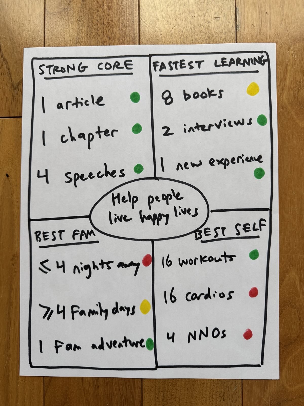 For me the core of my work is writing. So the first two things I measure are publishing one new article (on somewhere like CNBC or HBR) and writing one chapter of a new book. Writing, writing, writing! And a big way I get ideas into the world is through keynote speeches. That’s the 4 speech goal I have each month. Doesn’t always happen but last month I was green on all three.